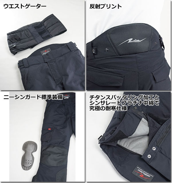 防水・透湿素材、ウォーターシールド採用、寒風はもちろん、不意の雨もシャットアウトするフルスペックウインターパンツ。