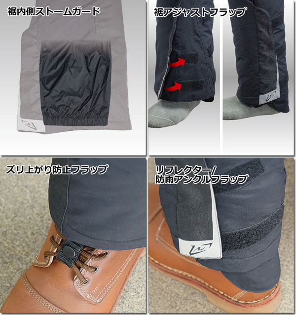 外気を遮断するためにウエスト部に脱着式ゲーターを装備、裾にはストームガードを備え寒気の侵入を許しません。